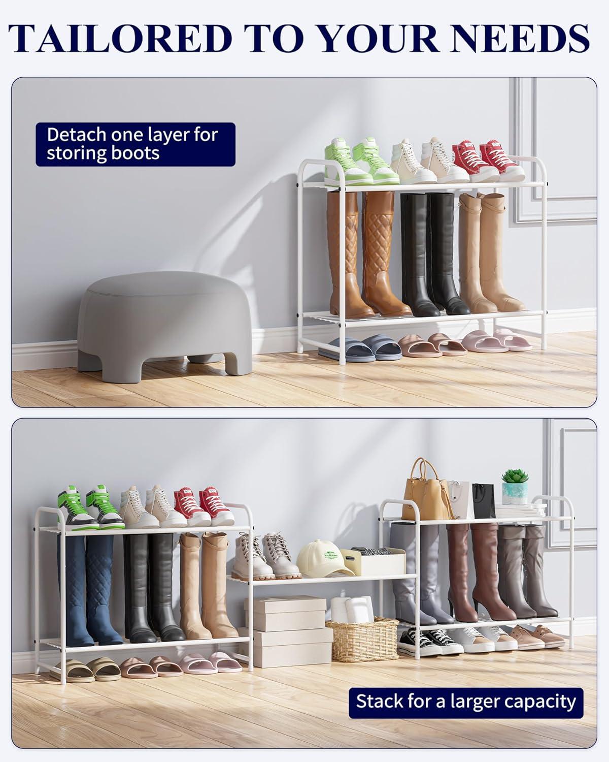 STACKABLE DESIGN: Kitsure closet shoe organizer features a detachable and stackable design perfect for customizing storage to fit your space. You can either detach one layer to place your boots or pile up 2 or more racks to organize your shoes, bags, suitcases, and more in a limited space.